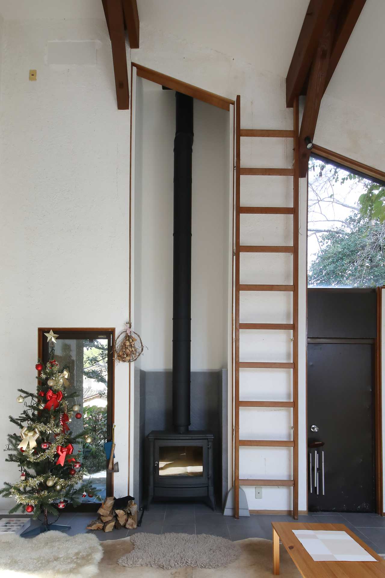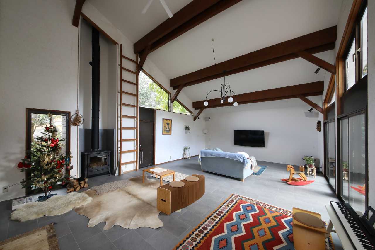 特に天井の痛みが激しかったリビングは、補修・修復を行いながら天井高を活かした開放感あふれる空間はそのままに、薪ストーブを設置し家族が自然に集まる場所に。そして、大きな窓からは庭の緑や季節の移ろいが身近に感じられ、暮らしの中に非日常の心地よさを演出してくれます。