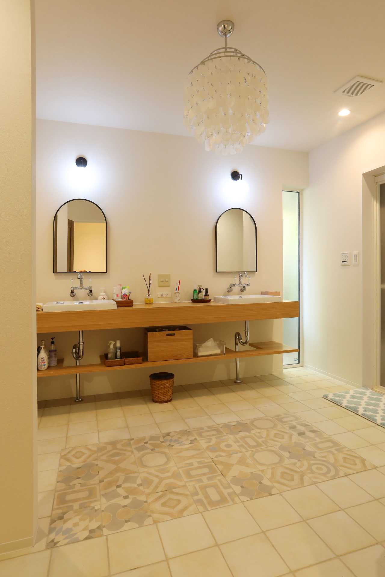 広々とした洗面脱衣とファミリークロークを設けることで、家族全員が快適に身支度でき、洗濯・収納など家事動線もスムーズに行えるよう生活スタイルに合わせて間取りも変更し、意匠性の高い造作洗面台や造作家具も設置。さらに、どのお部屋もお施主様のこだわりが詰まった建具や照明が融合した、唯一無二の空間になりました。